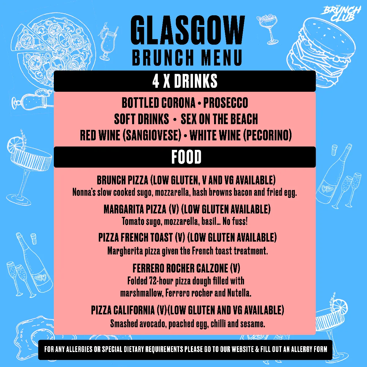 All Brunch Club events are listed with menu information relevant to the event on sale. For the purpose of The Brunch Club events listed on this this website, the following terms will be defined as: Gluten Free (GF) / Vegan (VE) / Vegetarian (VG). These options are available at most Brunch Club events, please view the specific menu for each event on the event page you’d like to attend. It is The Purchasers’ responsibility to make sure all accompanying ticket holders are informed of the menu choices and to make the correct selection on behalf of all attendees. For further questions regarding this issue, please contact The Brunch Club customer service team HERE.